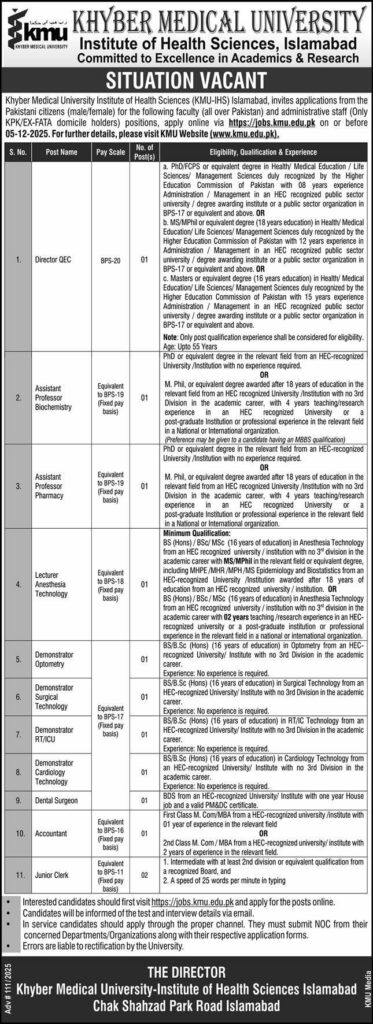 Candidates, if you are seeking Institute of Health Sciences Islamabad Jobs 2025 Online Application yes. Then it would help if you tried to complete these Institute of Health Sciences Islamabad Jobs because here you can easily apply for these vacancies: Director QEC, Assistant Professor Biochemistry, Assistant Professor Pharmacy, Lecturer Anesthesia Technology, Demonstrator Optometry, Demonstrator Surgical Technology, Demonstrator RT/ICU, Demonstrator Cardiology Technology, Dental Surgeon, Accountant, Junior Clerk.