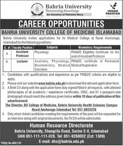 The last date to apply for this job is within 10 days.Bahria University Jobs 2025 Advertisement