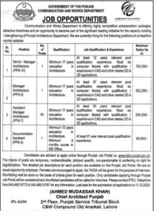 Candidates, if you are seeking Communication and Works Department Jobs 2025 in Lahore, yes. Then it would help if you tried to complete these Communication and Works Department Jobs because here you can easily apply for these vacancies: Senior Manager Architecture (PPS-10), Manager Architecture (PPS-8), Assistant Manager Architecture (PPS-7), and Documentation Assistant (PPS-4).