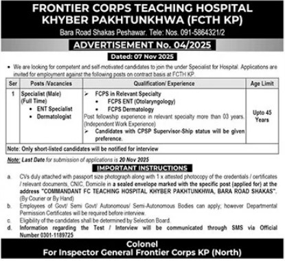 The last date to apply for this job is 20th November 2025.Frontier Corps Teaching Hospital Jobs 2025 Advertisement