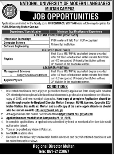 Both Male and Female candidates can apply for these National University Jobs who have the Qualification: First Class MS/MPhil/ equivalent degree awarded after 18 Years of education in the relevant field from an HEC-recognized University/Institution with no 3rd division in their academic career. URER (VISITING) First Class MS/MPhil/ equivalent degree awarded after 18 Years of education in the relevant field from an HEC-recognized University/Institution with no 3rd division in the academic career, and many more experienced candidates should apply before 28 November 2025.