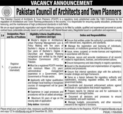 Candidates if you are seeking Pakistan Council of Architects and Town Planners Jobs 2025 yes. then it would help if you tried to complete the Pakistan Council of Architects and Town Planners Jobs because here you can easily apply for this vacancy: Registrar.